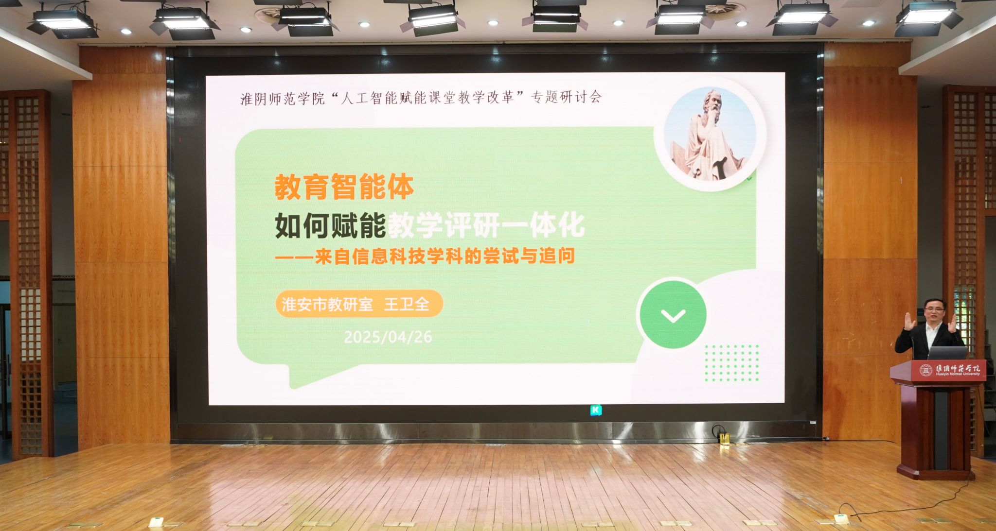 聘任仪式后举行了人工智能赋能课程教学改革专题研讨会,淮安市教学研究室中小学信息科技教研员王卫全、淮安市枫香路小学副董事长胡卫俊、云顶国际yd333教育科学公司副经理杨绪辉围绕教育智能体、生成式人工智能、专家学习者画像等教育主题作专题报告,并与现场师生展开交流研讨。